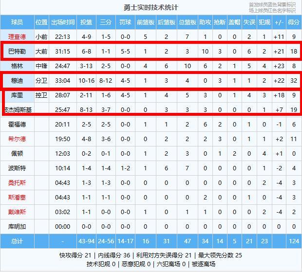 勇士(客场):穆迪32分4板3断、波杰姆斯基19分3板3助、巴特勒18分3板10助3断、希尔德11分2板2助3断、理查德9分7板1助、库里9分5板3助、格林8分10板6助2断、霍福德6分2板6助2断、波斯特4分7板